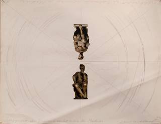 Pencil, photograph, wood and paper on cardboard